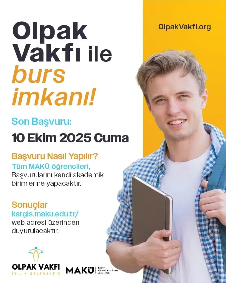 Olpak Vakfı bursuna başvuruda bulunmak isteyen öğrencilerimizin eğitim almakta olduğu Enstitü/Fakülte/Yüksekokul/Meslek Yüksekokullarına başvurmaları gerekmektedir. Son başvuru tarihi 10 Ekim 2025'tir.