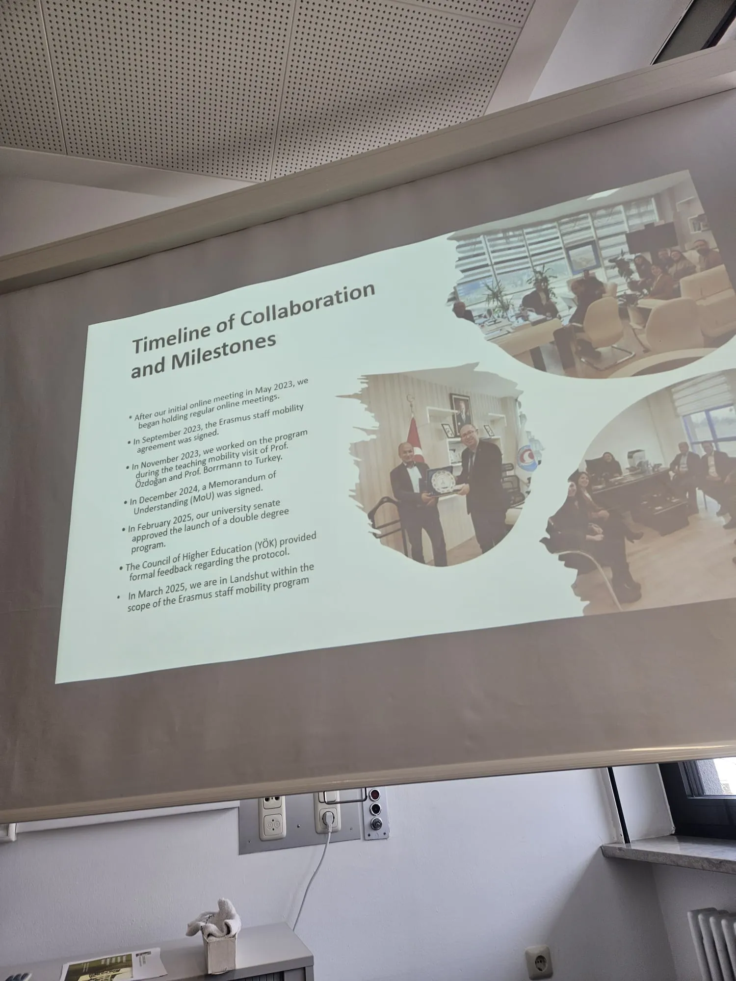 Ziyaretin ilk gününde, Landshut Uygulamalı Bilimler Üniversitesi Sosyal Hizmet Fakültesi yönetim kurulu toplantısına katılım sağlanmış; burada fakülte öğretim üyelerine yönelik olarak olası bir çift diploma programı hakkında bilgilendirici bir sunum gerçekleştirilmiştir. Sunumun ardından, Sosyal Hizmet Fakültesi öğretim üyeleri Prof. Dr. Stefan Borrman ve Prof. Dr. Mihri Özdoğan ile çift diploma programı üzerine detaylı görüşmeler yapılmıştır.